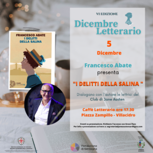 Il Club di Jane Austen Sardegna chiude il 2021 con la VI edizione del Dicembre letterario, che torna in presenza dove tutto ha avuto inizio, Villacidro. «Quest’anno abbiamo predisposto un programma con tre appuntamenti interamente dedicati ai libri – afferma Giuditta Sireus, direttrice artistica del Club –. L’associazione aveva piacere di riproporre il suo progetto di chiusura dell’anno lavorativo e rinnovare l’impegno nella promozione della lettura soprattutto a Villacidro, dove il Club è nato».
